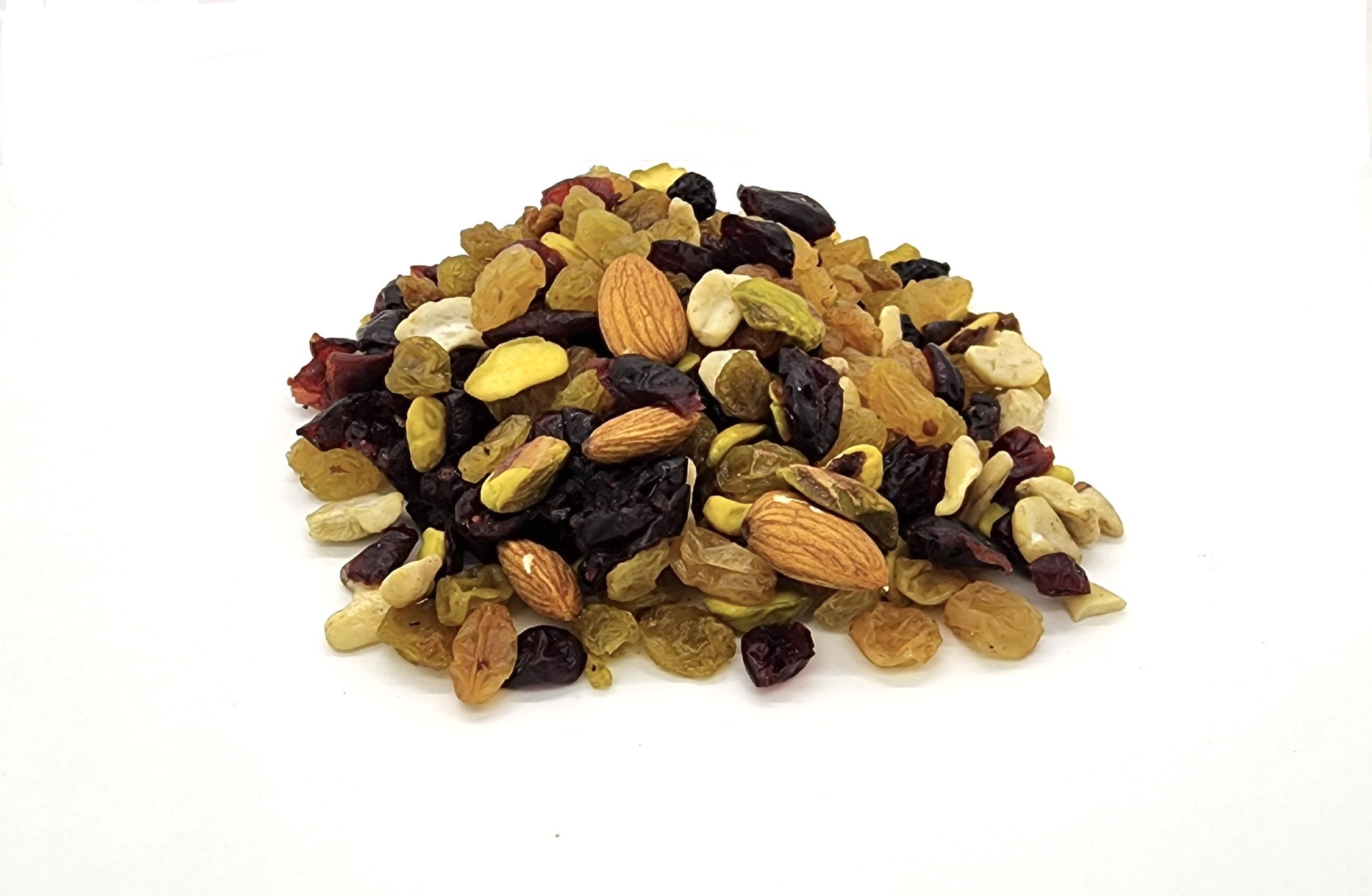 A flavorful combination of pistachios, cashews, almonds, dried blueberries, golden raisins, and cranberries. This mix offers a balanced taste of nutty crunch and fruity sweetness, perfect for snacking, trail mixes, or gourmet treats.